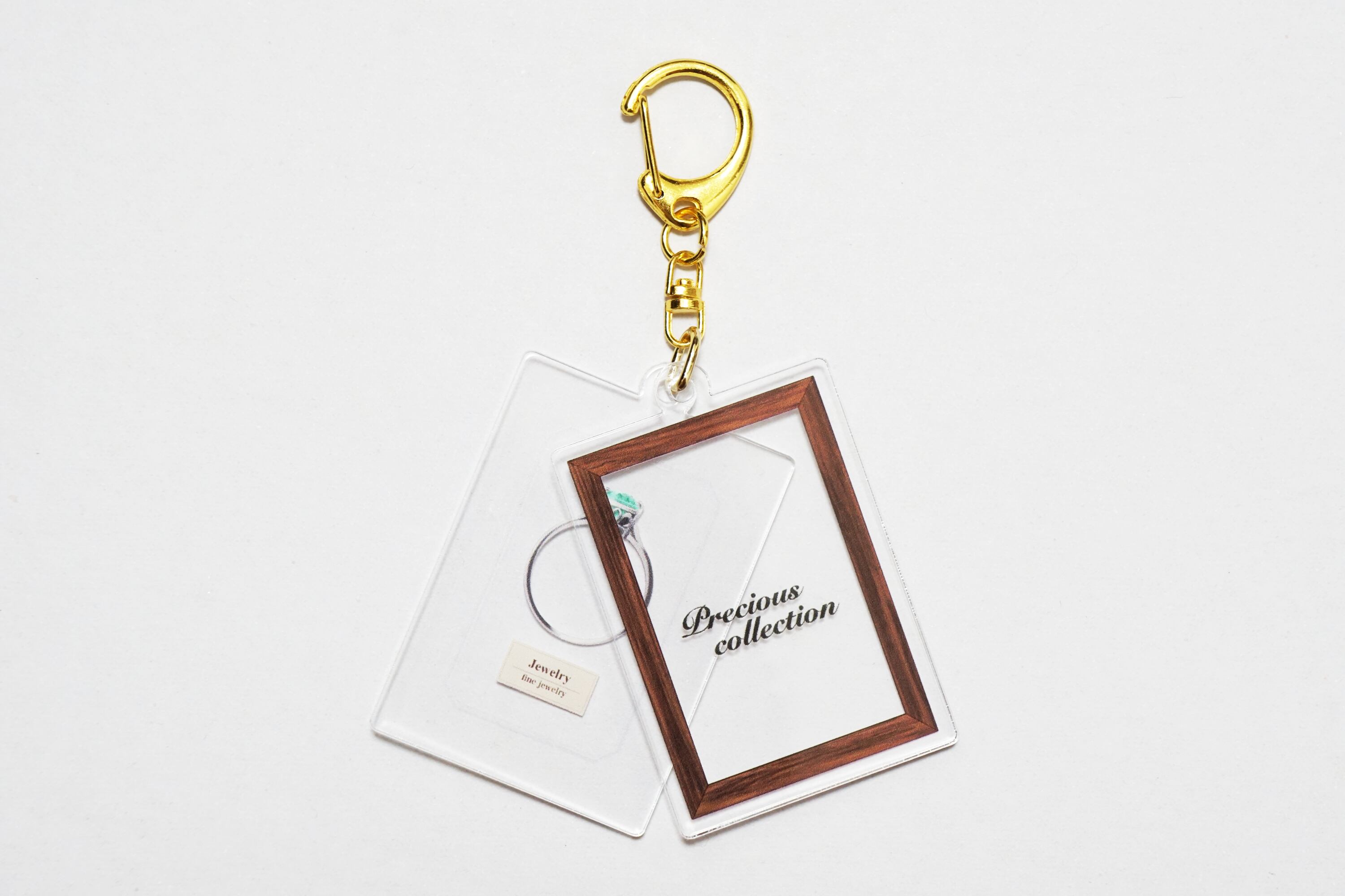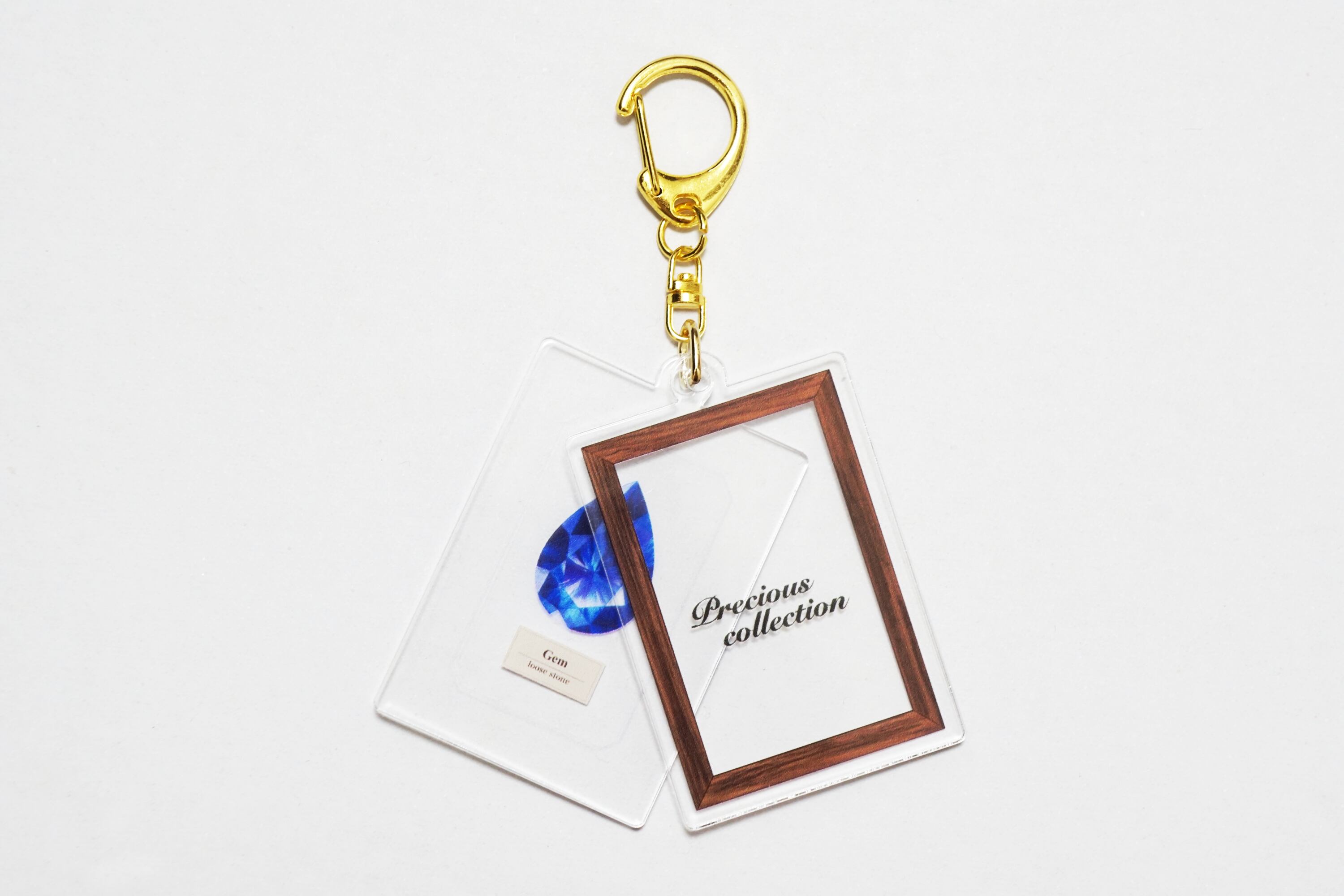 2枚の透明なアクリル板に、標本と額をそれぞれプリントした重ね式のオリジナルキーホルダーです。